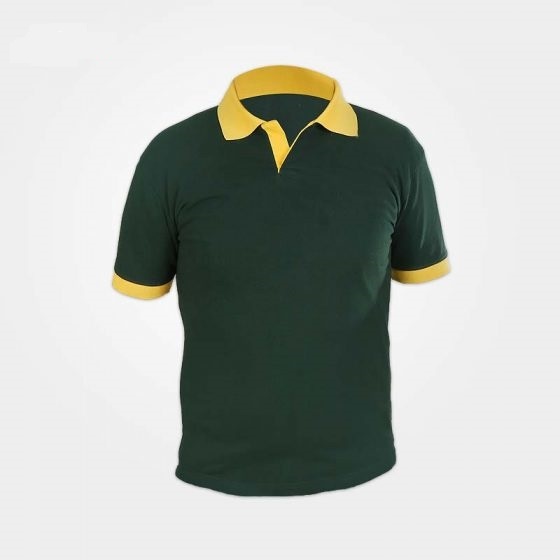 تی شرت فوق به رنگ سبز زرد می باشد، رنگ اصلی تی شرت سبز، رنگ یقه و سر آستین های تی شرت زرد می باشد. یقه تی شرت مدل ترکیبی بدون دکمه، قد تی شرت تا کمر می باشد.