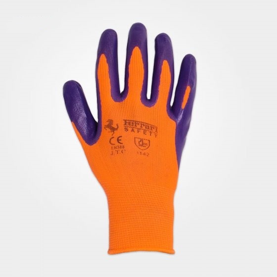 کف دستکش بنفش با پوشش نیتریلی لاتکسی و پشت دستکش نارنجی کاموایی می باشد. سرانگشتان نیز دارای پوشش لاتکسی می باشد. دستکش به طور کامل به دست می چسبد. پوشش کف دستکش برای جلوگیری از لغزش قطعات و خراشیدگی دست در حین انجام کار می باشد.