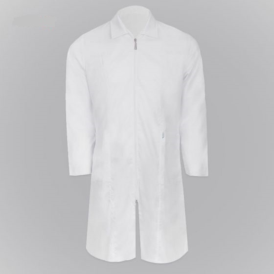 روپوش پزشکی زنانه به رنگ سفید با دو جیب مربعی و آستین بلند ساده، مدل یقه ترکیبی و نحوه بسته شدن روپوش زیپی، دارای کمربند نیز می باشد، در سایز های ۳۶ تا ۴۶ عرضه می گردد، که مناسب بانوان پزشک و پرستار است.