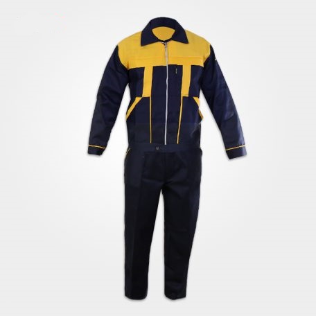 لباس کار فوق با رنگ سرمه ای زرد طراحی شده، رنگ اصلی لباس سرمه ای و سر شانه لباس کار قسمت جلو و پشت رنگ زرد می باشد.