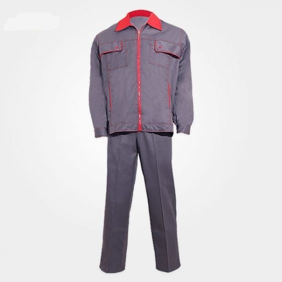 لباس کار فوق به رنگ طوسی تیره با یقه قرمز می باشد. دارای دو جیب دکمه ای روی سینه لباس کار و دو جیب درز پهلو پایین لباس دوخته شده. شلوار لباس کار نیز دارای دو جیب درز پهلو می باشد.