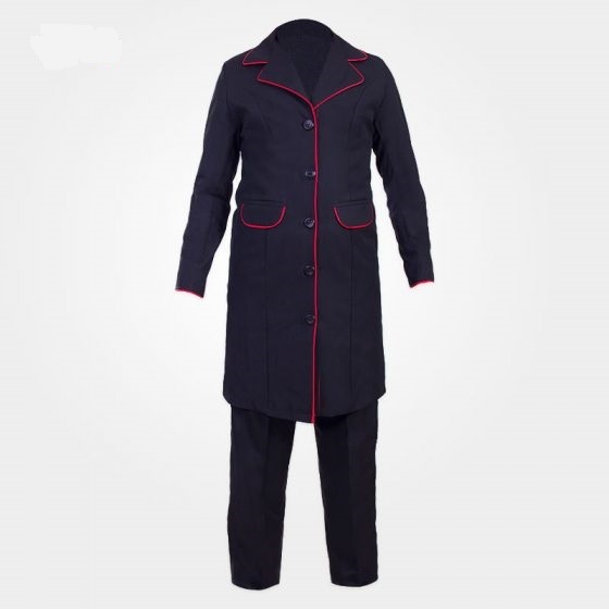 مانتو شلوارهای اداری از جنس ترگال بوده و در سایزهای متفاوت دوخته می شود. لباس مذکور به رنگ مشکی بوده و با نوار قرمز طراحی شده است.