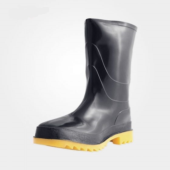 چکمه کوتاه مشکی با جنس پی وی سی جهت حفاظت از پا در محیط های آبی می باشد که خطری پنجه پا را تهدید نمی کند زیرا این چکمه پنجه فولادی ندارد.
